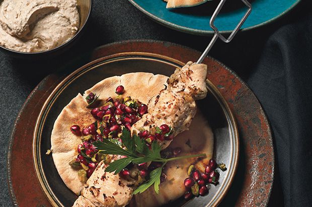 Turkish-Spiced Chicken Kebabs with Pomegranate Relish and Tahini Yogurt